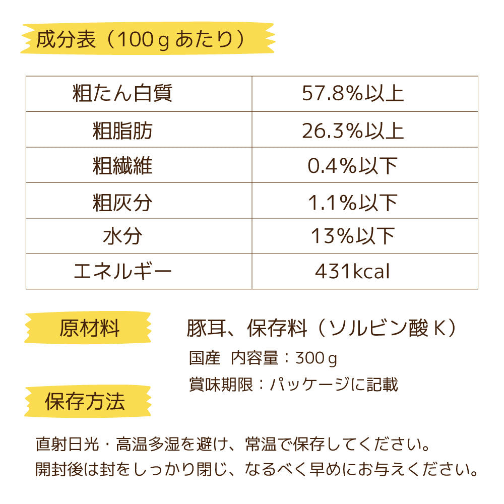 国産豚耳をじっくり乾燥させた、香ばしく噛みごたえのあるおやつ。