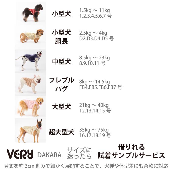 ※毛の多めのワンちゃんや、長毛犬種のワンちゃんは、ワンサイズ大き目の洋服をお選びいただくことをオススメします。